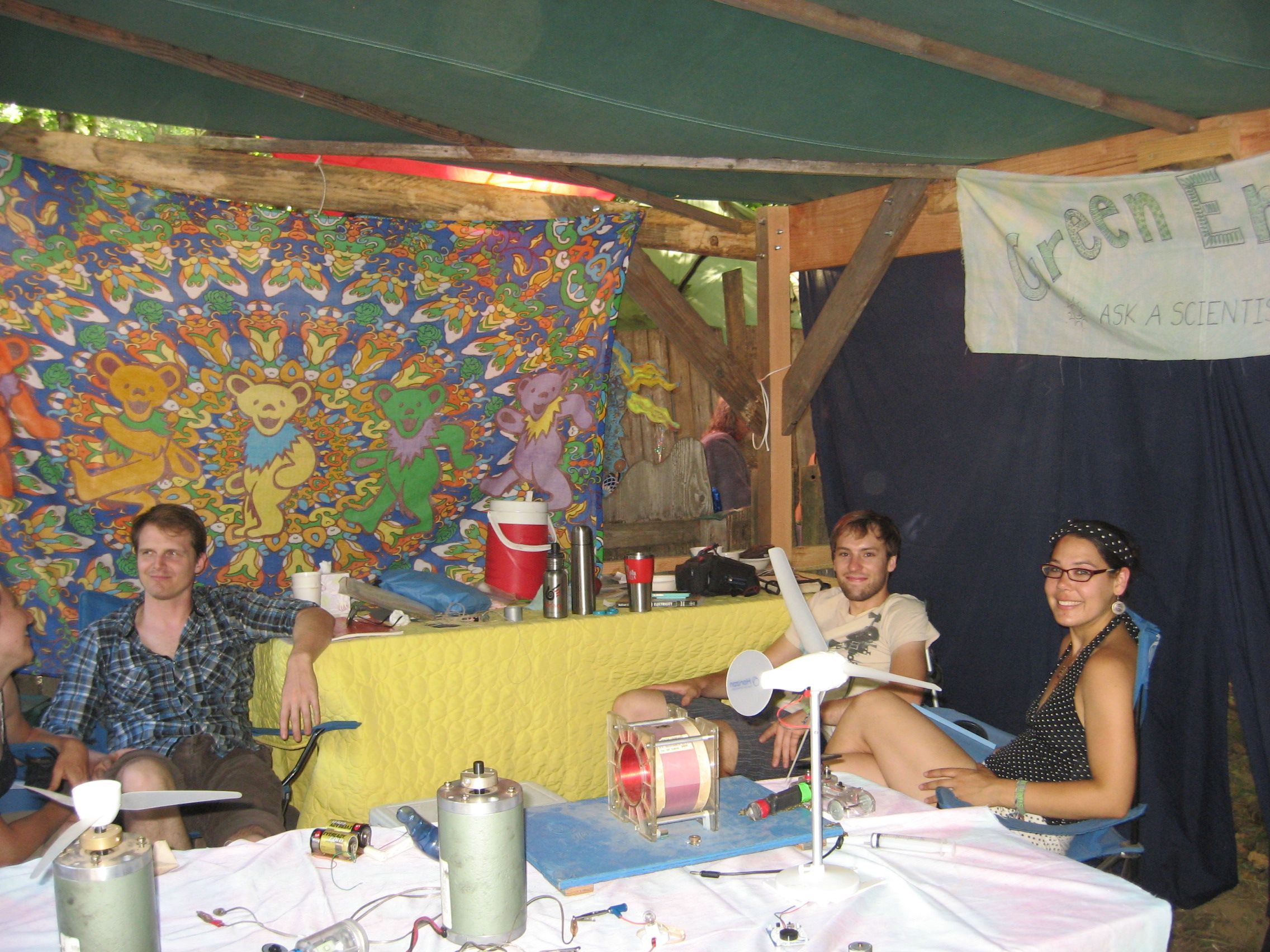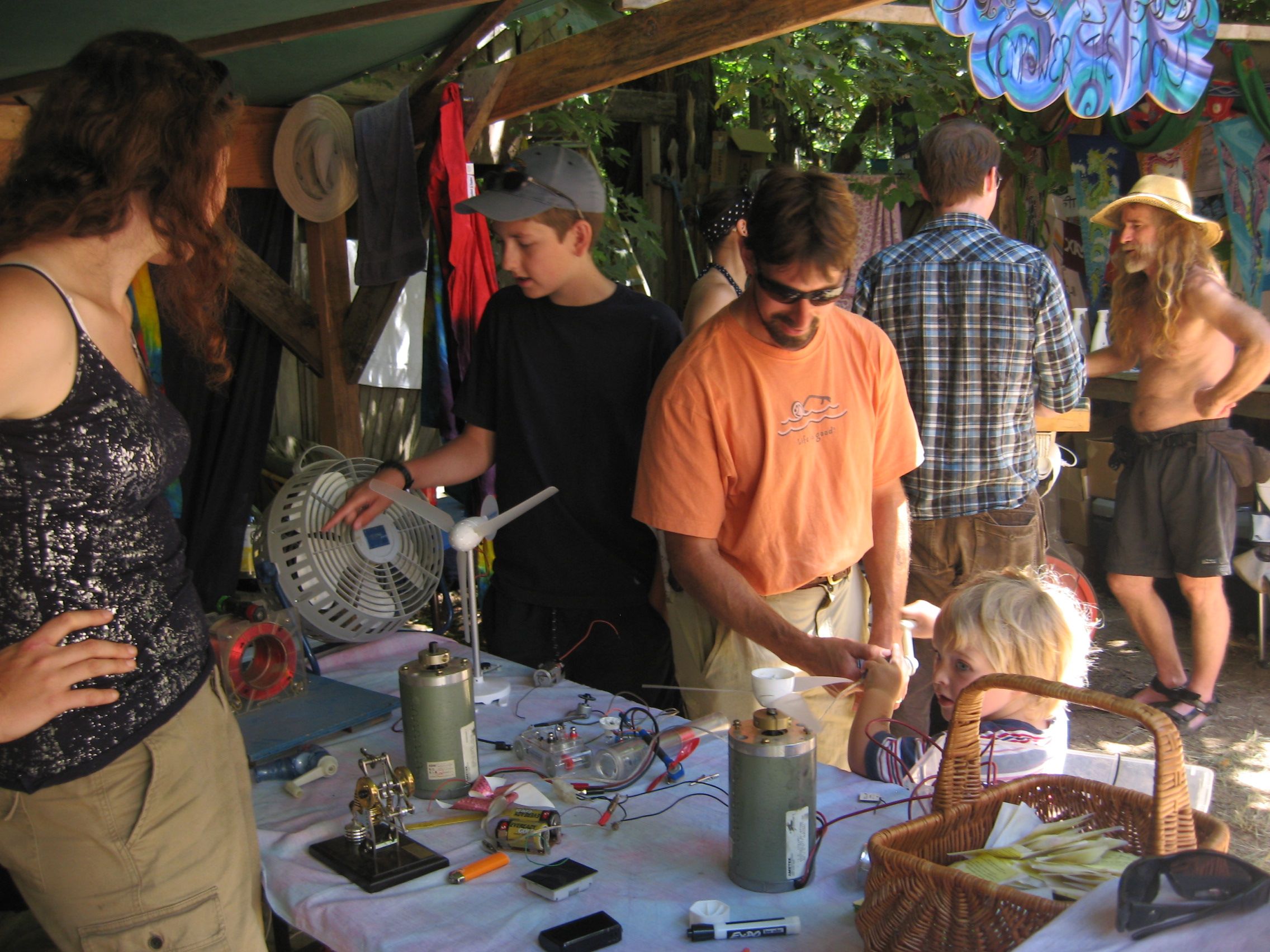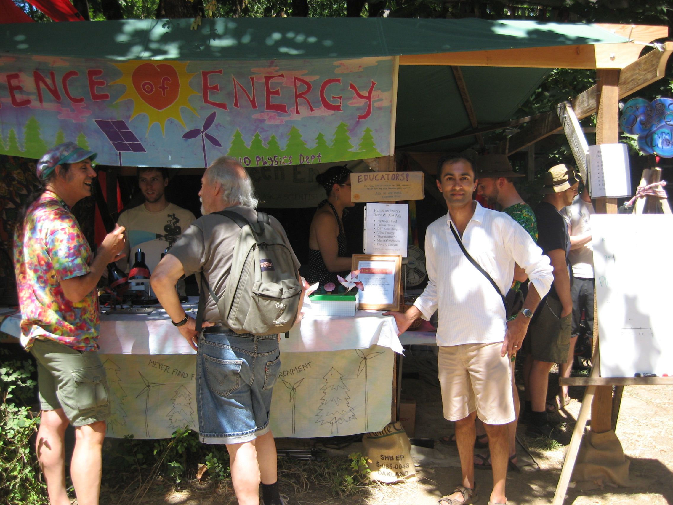 I’m involved in a lot of different outreach activities, but I added a new one to the list today that’s a bit stranger than the others: working at the physics booth at the Oregon Country Fair (http://en.wikipedia.org/wiki/Oregon_Country_Fair). The OCF is the yearly giant hippie gathering outside Eugene that’s full of art, music, performance, crafts, and creatively costumed (and notably un-costumed) people. Several of us, physics department faculty and graduate students, had a booth on energy and solar power, with hands-on activities involving photovoltaics, generators, motors, and related things:
