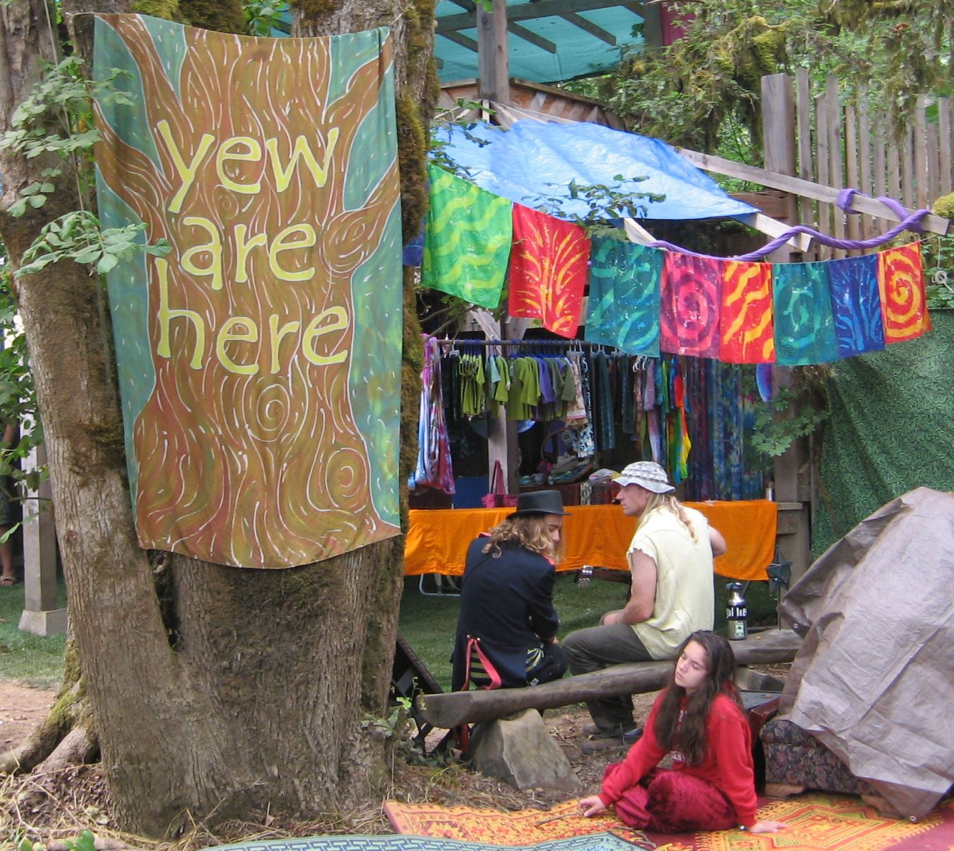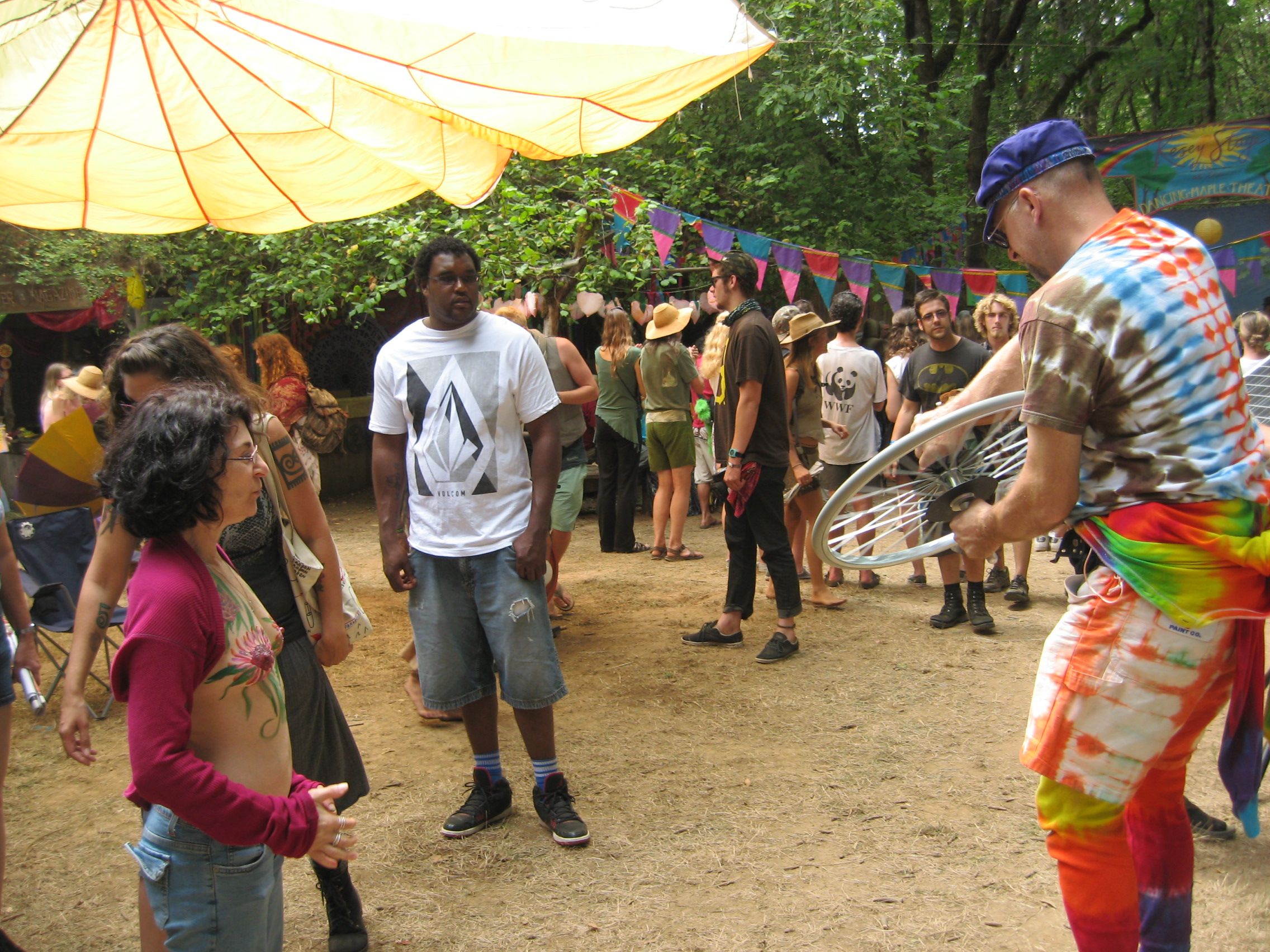 Like last year, several of us from the Physics Department manned a booth at the Oregon Country Fair, the long-running hippie / arts / music / performance / counterculture festival that occurs each year outside Eugene. I worked there today, which was lots of fun. Though our booth was mostly about energy — lots of hands-on demonstrations of converting it between various forms — I spent most of my time with the wheel shown above, spinning it and handing it to passers-by who I enticed to stand on a freely-rotating platform. Via the magic of conservation of angular momentum, tilting the wheel made the person and platform spin, and tilting it the other way induced the opposite rotation. It’s wonderful to feel the wheel “pulling” in different ways, and the demonstration (a classic one) was a huge hit. A few photos: