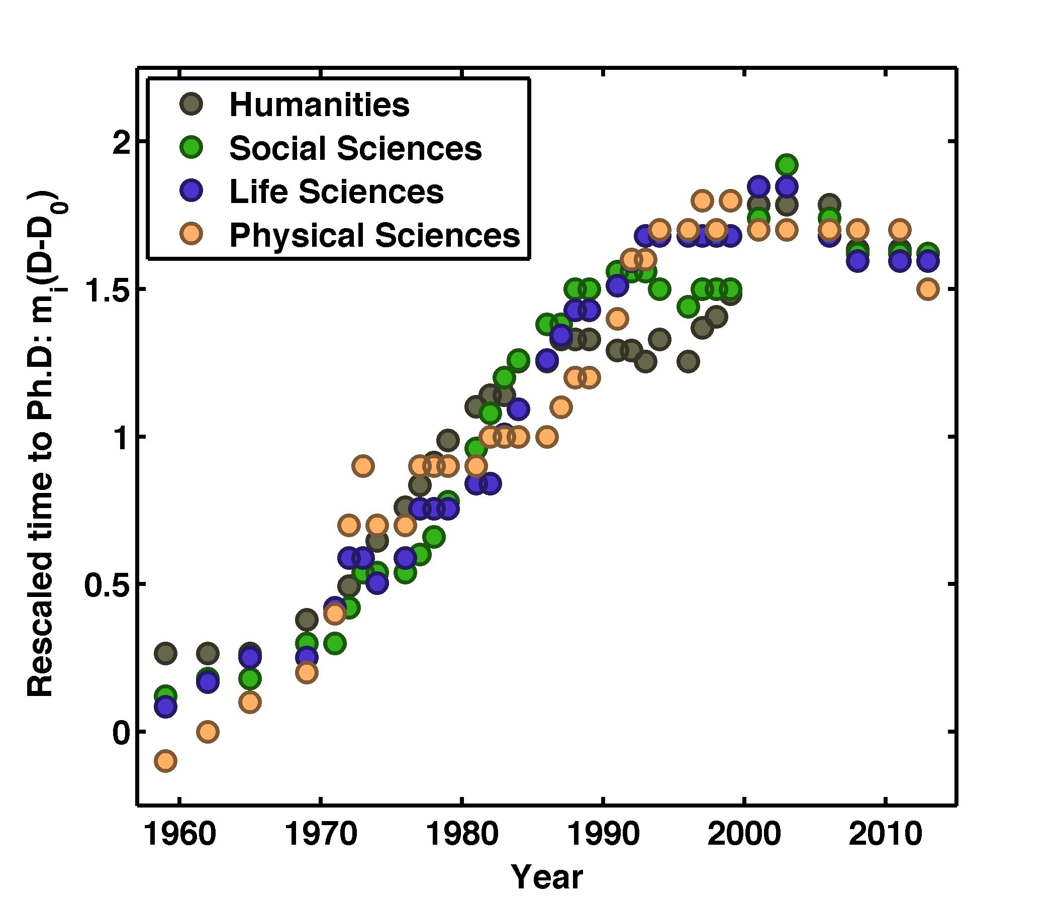 All the different field’s data collapse surprisingly well onto a single curve! (If you’re curious, the scale factors, setting the physical sciences’ m_i to 1, are 0.84, 0.60, 0.38 for life sciences, social sciences, and the humanities, respectively.) In other words, these fields differ in the magnitude of their increases in time-to-degree, but have nearly identical forms. Why should this be? Why should the way the duration of graduate school changes in physics mirror at all the way it changes in art history?