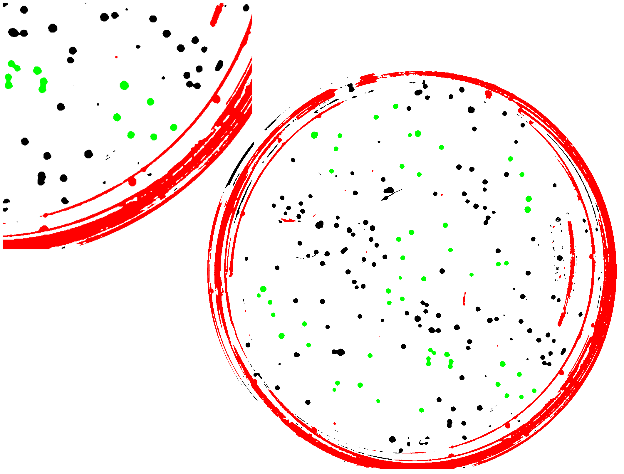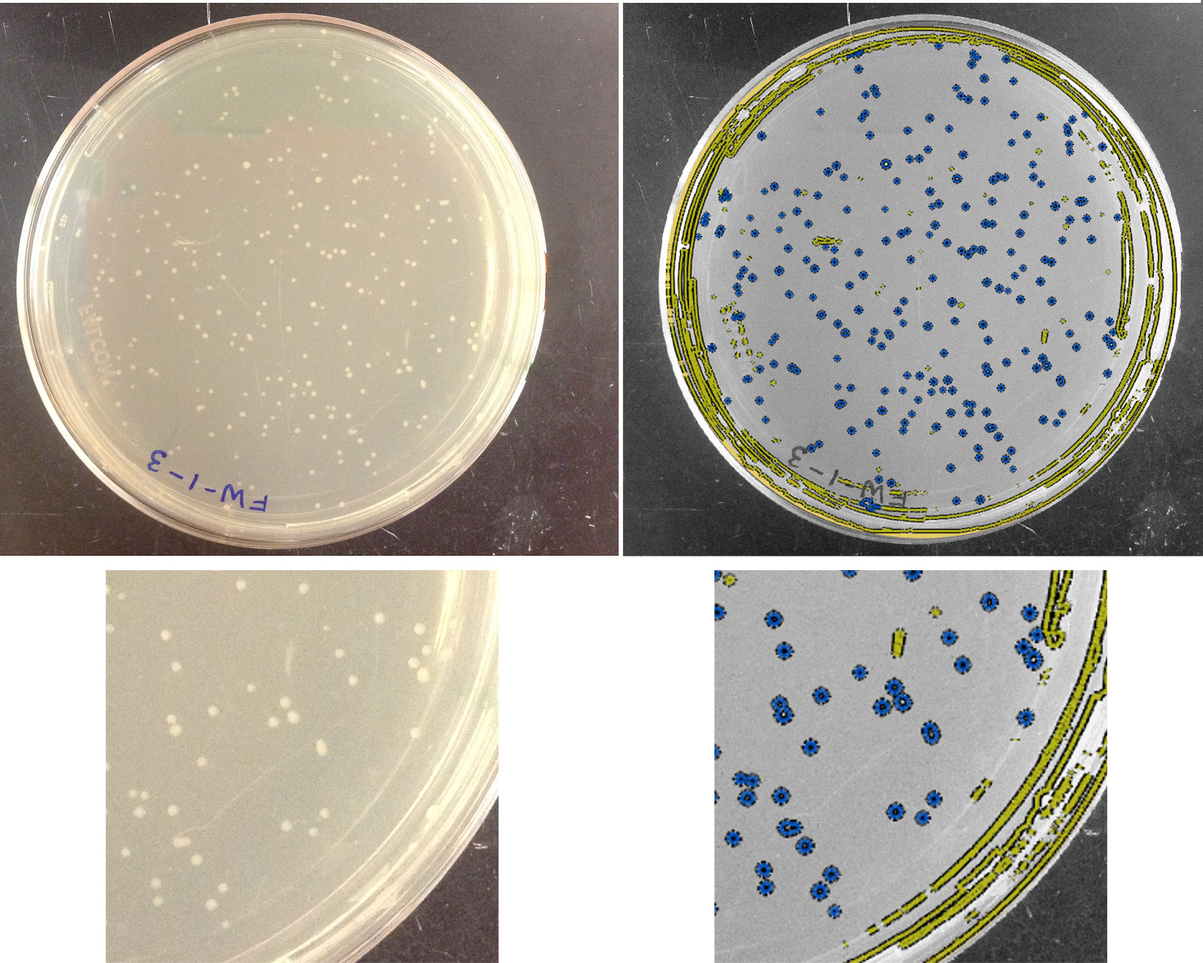 So, there it is! Machine learning applied to bacterial colonies. If you look at the plates, you can see regions in which colonies have grown together, making two conjoined circles. We could go further and “learn” how to identify these pairs, again starting with a training set of manually identified objects. We could also iterate this process, finding errors in the machine classification and adding this to our training set. The possibilities are endless…