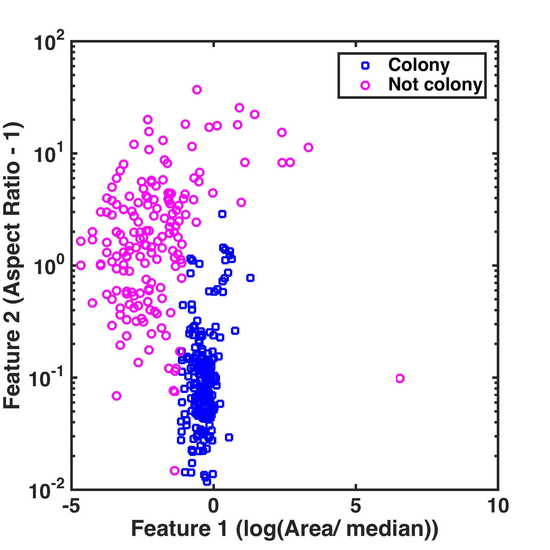 For each object, whether or not it’s in the training set, we can measure various properties: size, aspect ratio, intensity, orientation, etc. Like the pear and banana example in Part I, we want to create a boundary in the space of these parameters that separates colonies and not-colonies. What parameters should we consider? Let’s look at the area of each object relative to the median area of colonies, and the aspect ratio of each object, since these seem reasonable for distinguishing our targets. You might be aghast here — we’re having to be at least a little clever to think of parameters that are likely to be useful. What happened to letting the machine do things? I’ll return to this point later, also.