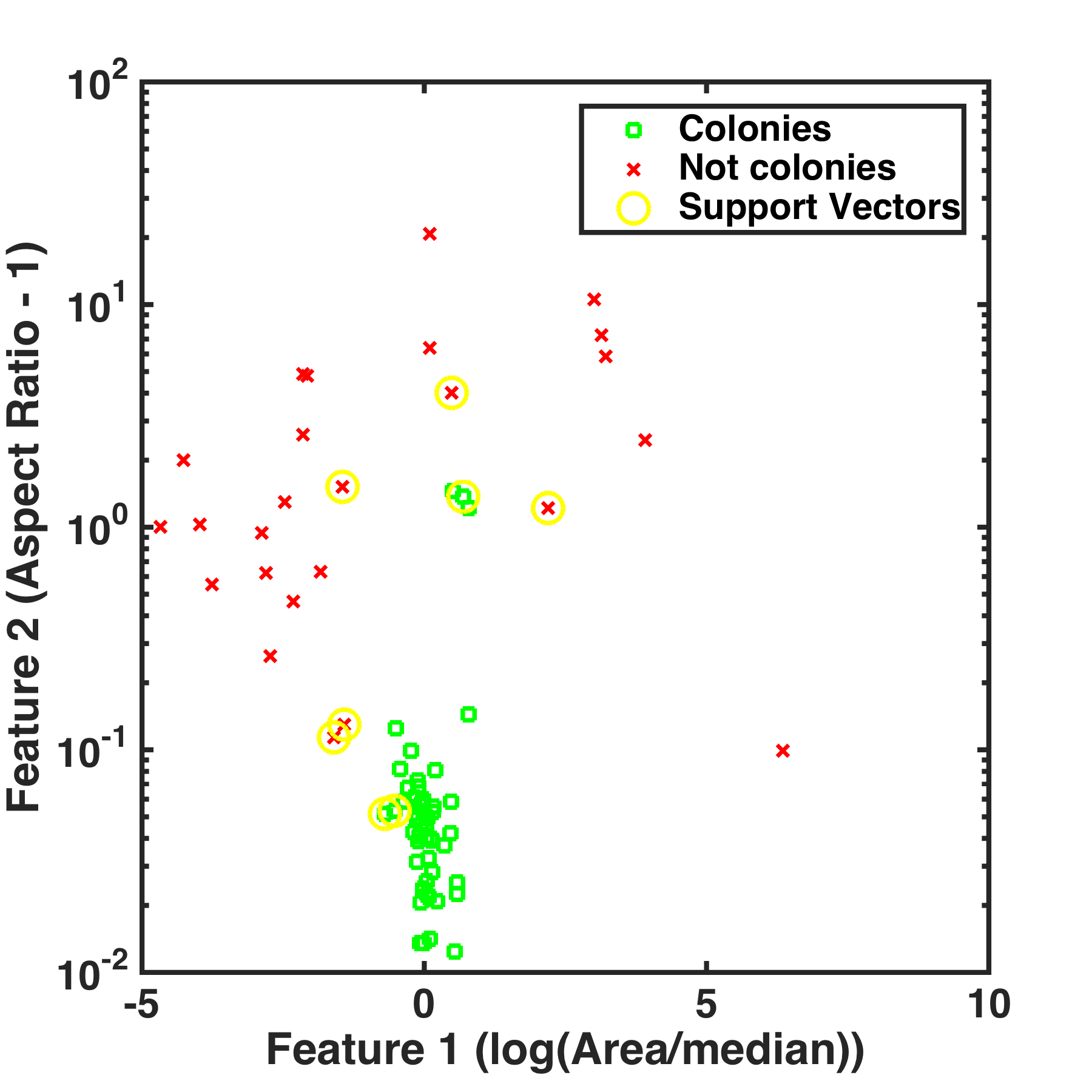It does seem like we should be able to draw a boundary between these two classes. We’d like the optimal boundary, that maximizes the gap between the two classes, since this should give us the greatest accuracy in classifying future objects. Put differently, we not only want a boundary that separates colonies from non-colonies, but we want the thickest boundary such that colonies are on one side and non-colonies on the other. Technically, we want to maximize the “margin” between the two groups. A straight-line boundary is fairly straightforward to calculate, but it’s obvious that such a boundary won’t work here. Instead, we can try to transform the parameter space such that in the new space we can aim for a linear separation. One might imagine, perhaps, that instead of area and aspect ratio, the coordinates in the new space are area^3 and (aspect ratio)^2*area^4, for example. Remarkably, one doesn’t actually need to know the transformation from the normal parameter space; all we need is the inner product of vectors in this space. This approach, of determining optimal boundaries in some sort of parameter space, is that of a support vector machine, one of the key methods of machine learning. The actual calculation of the “support vectors,” the data points that lie on the optimal margin between the two groups, is a neat exercise in linear algebra and numerical optimization. The support vectors for our “training set” of manually-curated groups in the bacteria plate image are indicated by the yellow circles above.