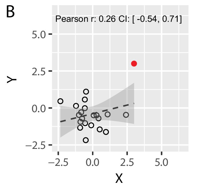 This one is easy to understand, though nonetheless common. The authors refer to situations like the one illustrated in their Figure 2, shown below, in which the correlation calculated between two variables is driven solely by a few, or even one, data points. In other words, the correlation coefficient doesn’t really represent the relationship among the data.