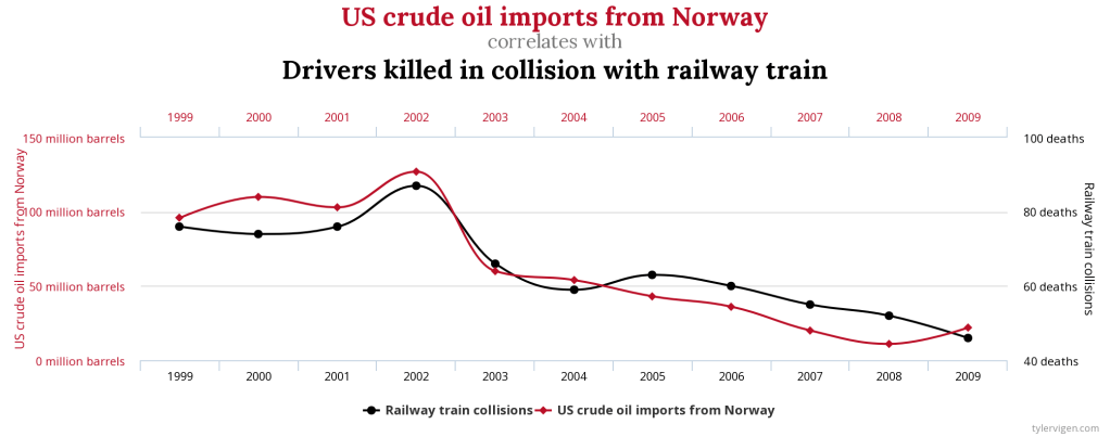 Not long ago I learned that “regression discontinuity analysis” is a thing — separately fitting curves to either side of some datapoint to infer the magnitude of a step that occurs at that point. In principle this is fine; in practice, noise will make it ripe for overfitting, in a way that is reminiscent of these spurious correlations. See here for an example. Again, plotting makes the flaws clear.