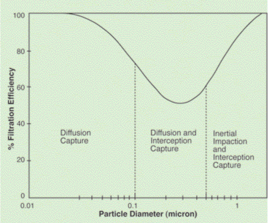 The reason is Brownian motion: the unavoidable random meandering of particles is greater the smaller they are, enhancing their likelihood of hitting a fiber. Particles can also hit via simple impact, and this is more likely for larger particles. Therefore very small particles are well-captured, very large particles are well-captured, and there’s a regime in between at which we have a minimum of our capture efficiency. There’s a lot of physics in the details of the actual capture, but that doesn’t matter for the basic picture sketched here. These mechanisms, plus some neat long-range electrostatics, are qualitatively described in this excellent “Minute Physics” video.