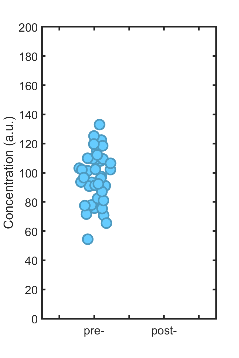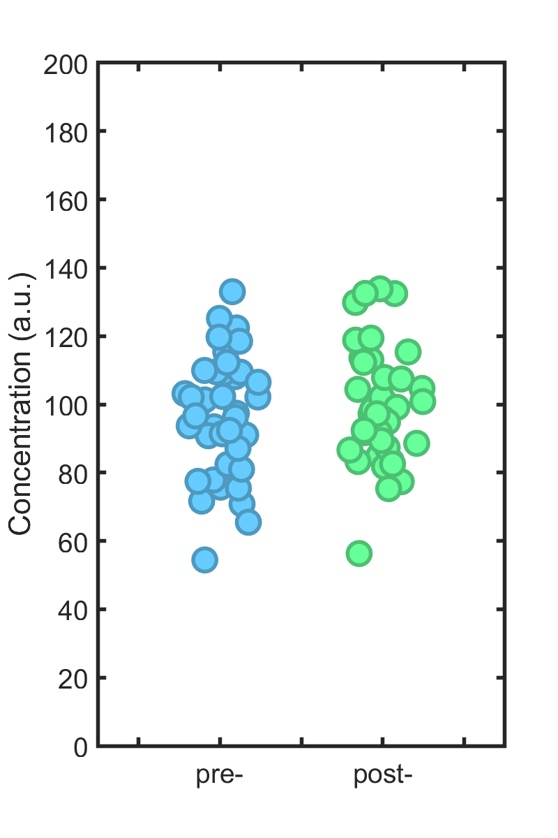 Each individual is treated with some drug, and then the immune cell concentration is again measured; we wish to know how much it has changed. (Please, dear reader, don’t ask if the concentration “is different.”) The new, post-treatment values are shown in the right hand plot. If they look similar to the old ones, that’s because the effect size is zero; I simulated 40 points with exactly the same mean (100) as the other set.