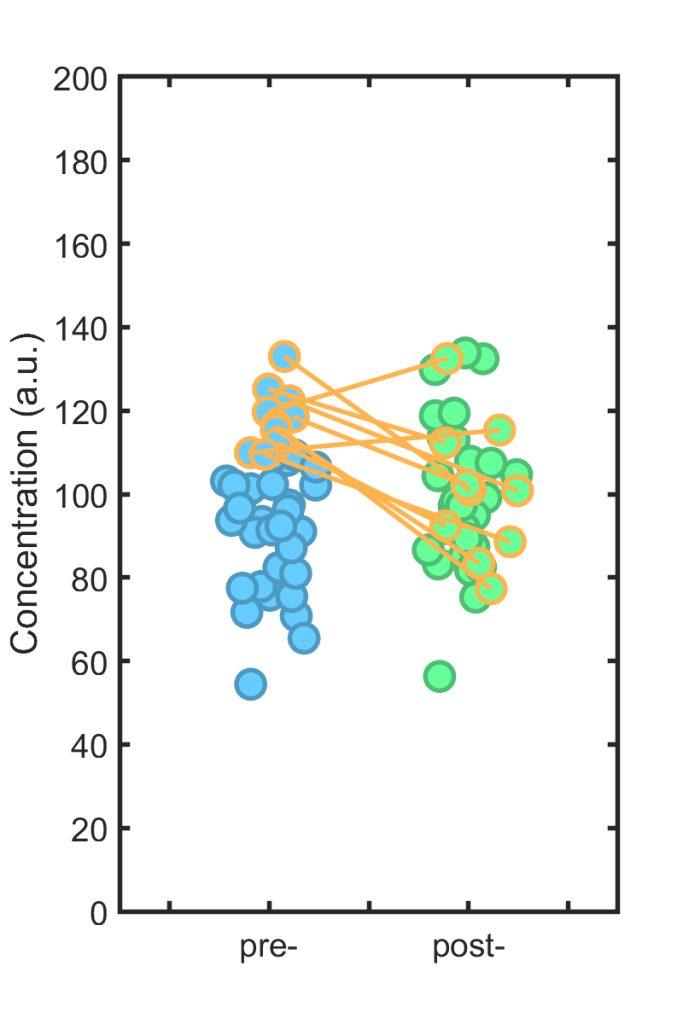 Perhaps, one imagines, there are individuals with normally high immune cell levels, or we care about values above some threshold. We take the top 25% of the pre-treatment set (orange borders, below), assess what happens to these individuals post-treatment (orange lines)…