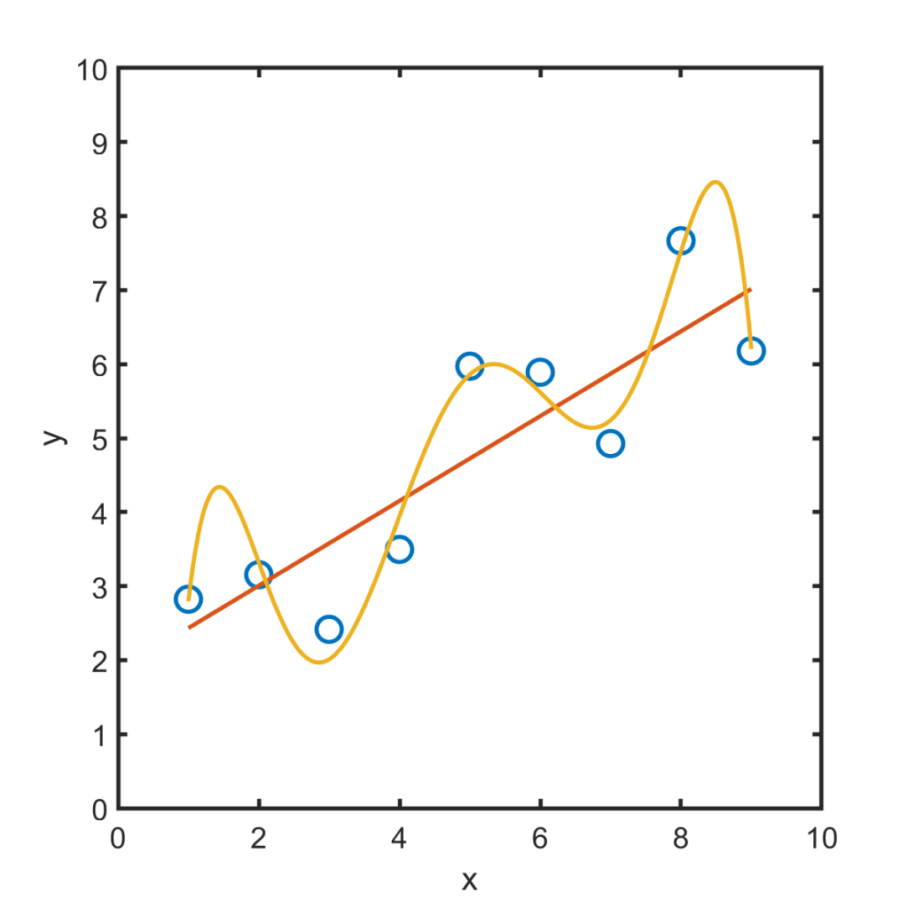 More importantly, you may be thinking: “Isn’t this just regression to the mean?” I agree with that, too. Makin and Orban de Xivry comment that this is similar, and also note a resemblance to overfitting. Overfitting is applying a model that’s more complex than the data warrants. The orange curve below, for example, is terrible, even though it fits the data points better than the red line. The orange curve follows the wiggles of noise as if they were real, and so will be less robust to new data.