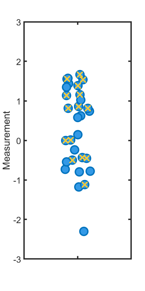 Suppose, for concreteness, that one measures a bunch of values as shown (blue points), perhaps the change in people’s heart rate after taking some drug, and one wants to assess whether the signal is “significantly” different from zero. Suppose further that p > 0.05 for the dataset — a “non-significant result.” I did, in fact, draw the simulated points from a distribution with zero mean, so the true effect size is zero. How might one massage the points to yield significance?