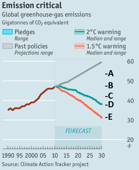 When covering this in class, about a week before the exam, I showed the following graph showing global greenhouse gas emissions over time, pointing out the curves this would have to follow in the future if overall warming of the planet is to be limited to 2C (greenish curve), or 1.5C (orange curve). I blocked the future curve that corresponds to what warming will be if countries follow their Paris Accord pledges. Note that in the Paris talks, about 190 countries agreed that warming should be limited to 2 C, ideally 1.5 C, to avoid major harm to people and our environment. (Graph source: [1]). Where will the pledged emission curve go? (To A, B, C, D, or E?):