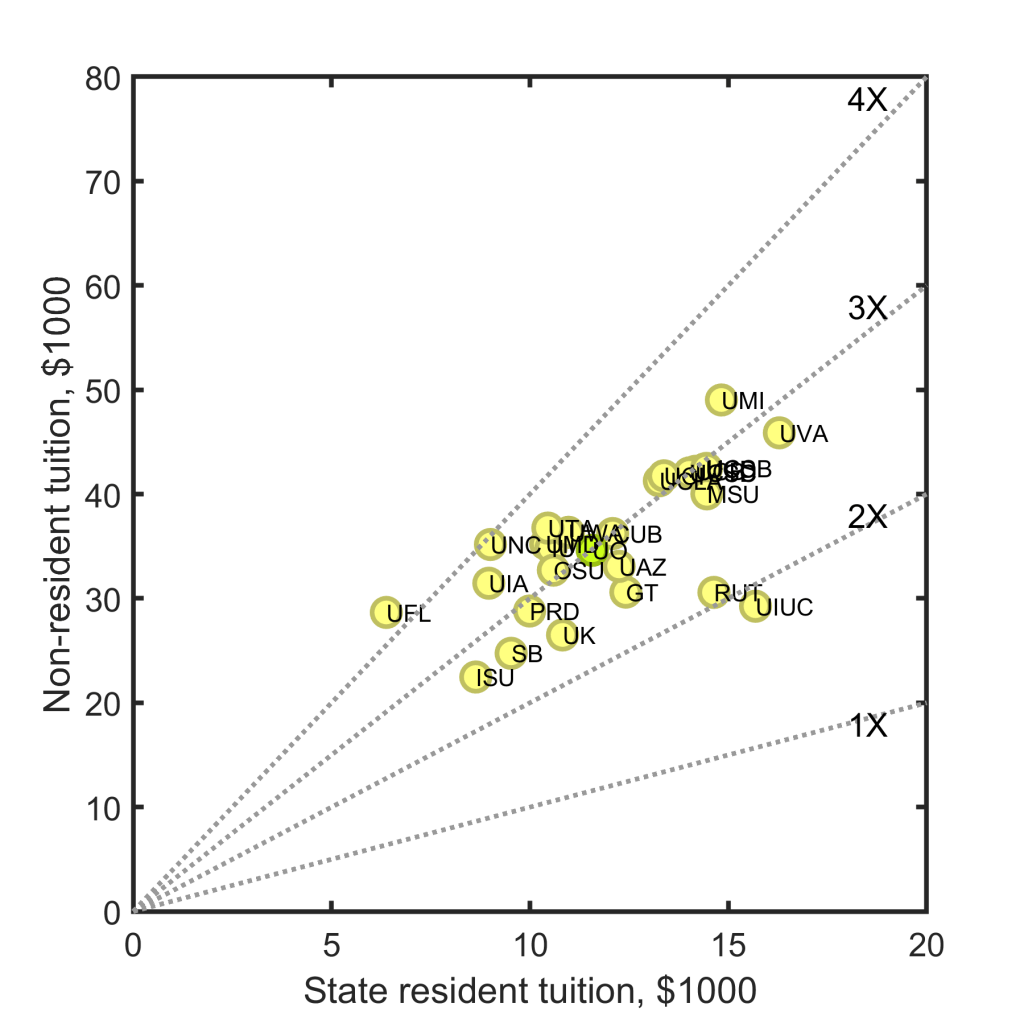 When I graduated from the University of California at Berkeley in 1997, non-California-residents made up about 10% of the undergraduate population [1]; the fraction now is 25% [2]. Here at the University of Oregon (UO), also a public university, out-of-state undergraduates are 44% of the student body. Why have these numbers increased so much at top state schools? The obvious, well-known, and correct answer is money. Non-resident tuition at UO is over three times larger than resident tuition ($35k/year vs. $11k). Out-of-state students are lucrative. It is often noted that the rise in non-resident student mirrors a decline in public funding for higher education throughout the US. Currently, legislators in California are considering requiring an increase in the in-state enrollment at UC campuses, capping non-resident enrollment at 10% in exchange for greater state support [3]. (The system-wide average is currently 19%.) I wonder if this will actually happen.