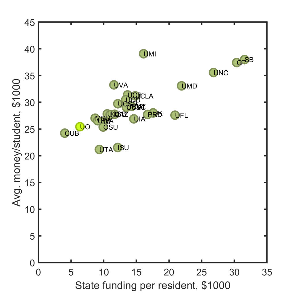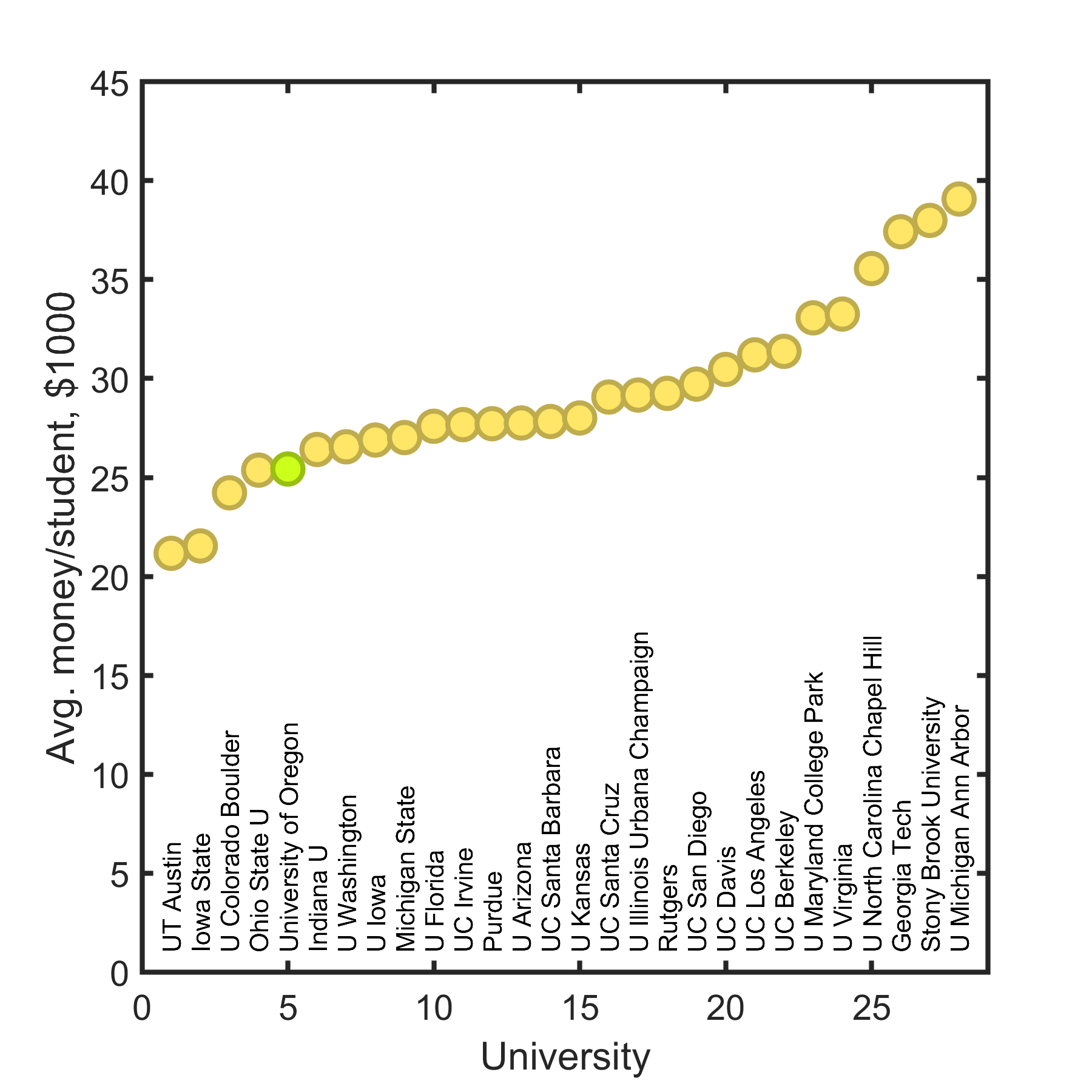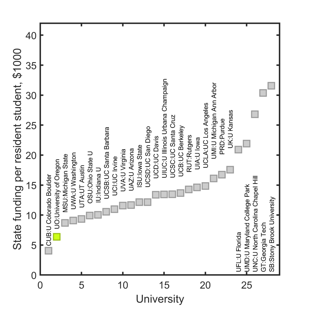 The range is amazing, from about $4k/student (Univ. of Colorado, Boulder) to over $31k/student (State University of New York, Stony Brook). UO is the second lowest, getting $6k/student from the state of Oregon.
