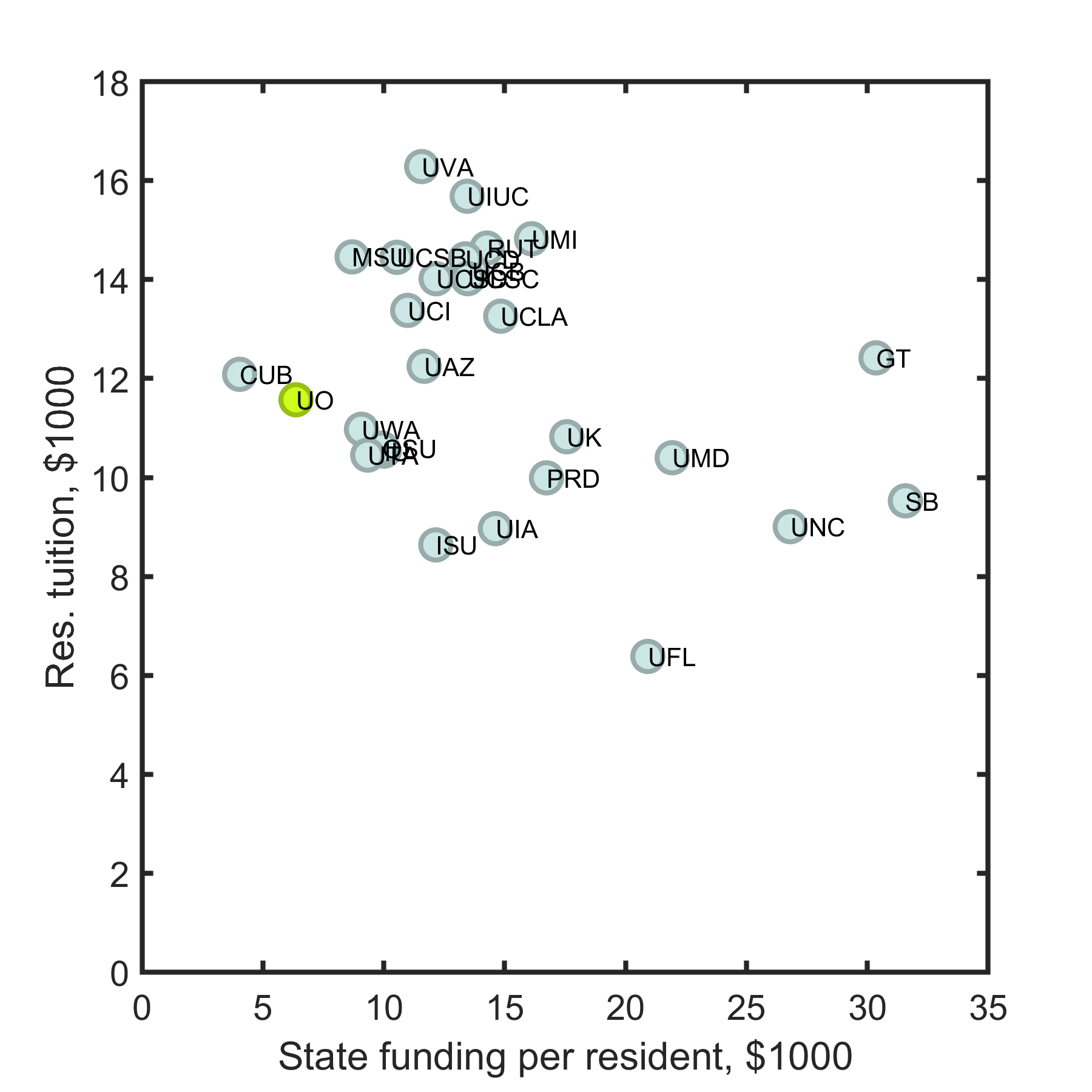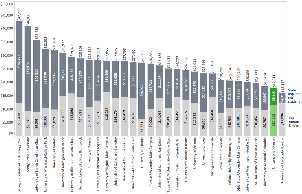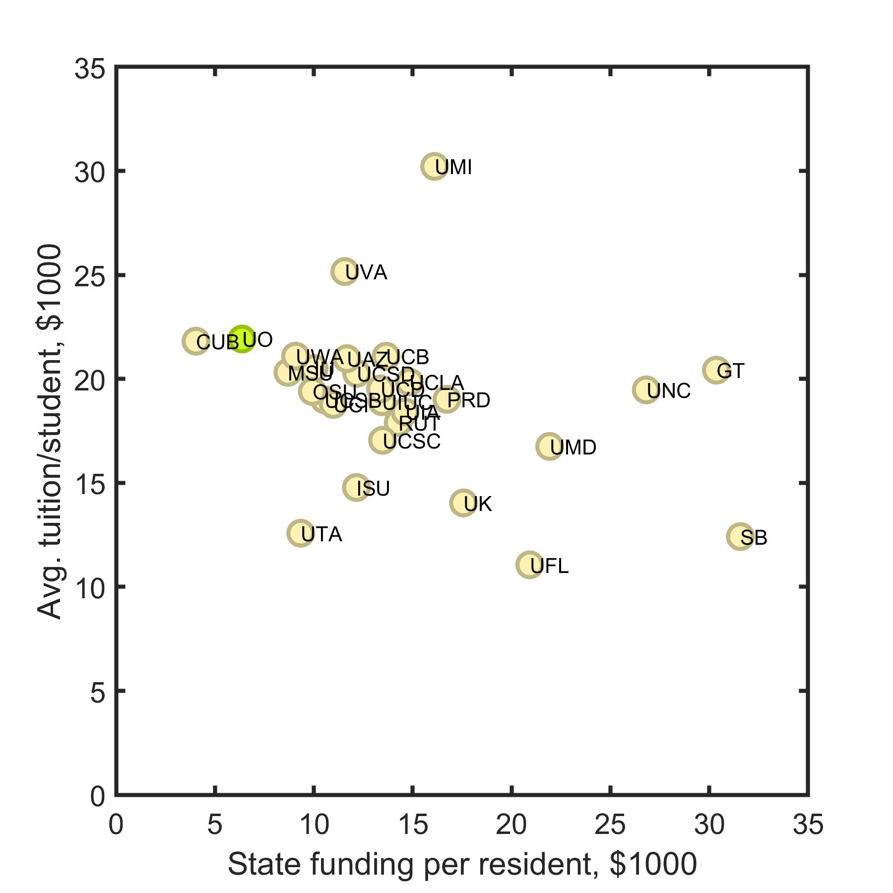 The range is amazing, from about $4k/student (Univ. of Colorado, Boulder) to over $31k/student (State University of New York, Stony Brook). UO is the second lowest, getting $6k/student from the state of Oregon.