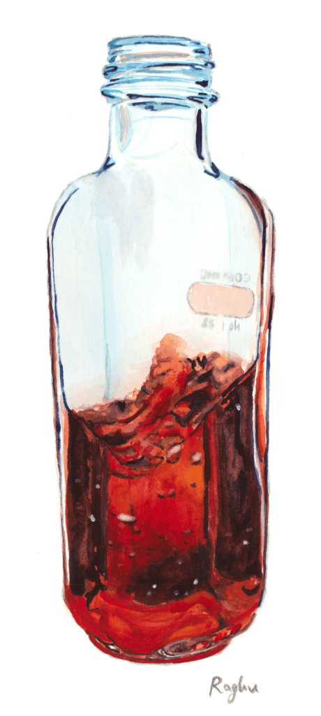 A bottle with red liquid. Despite a smudge, I like how it turned out.