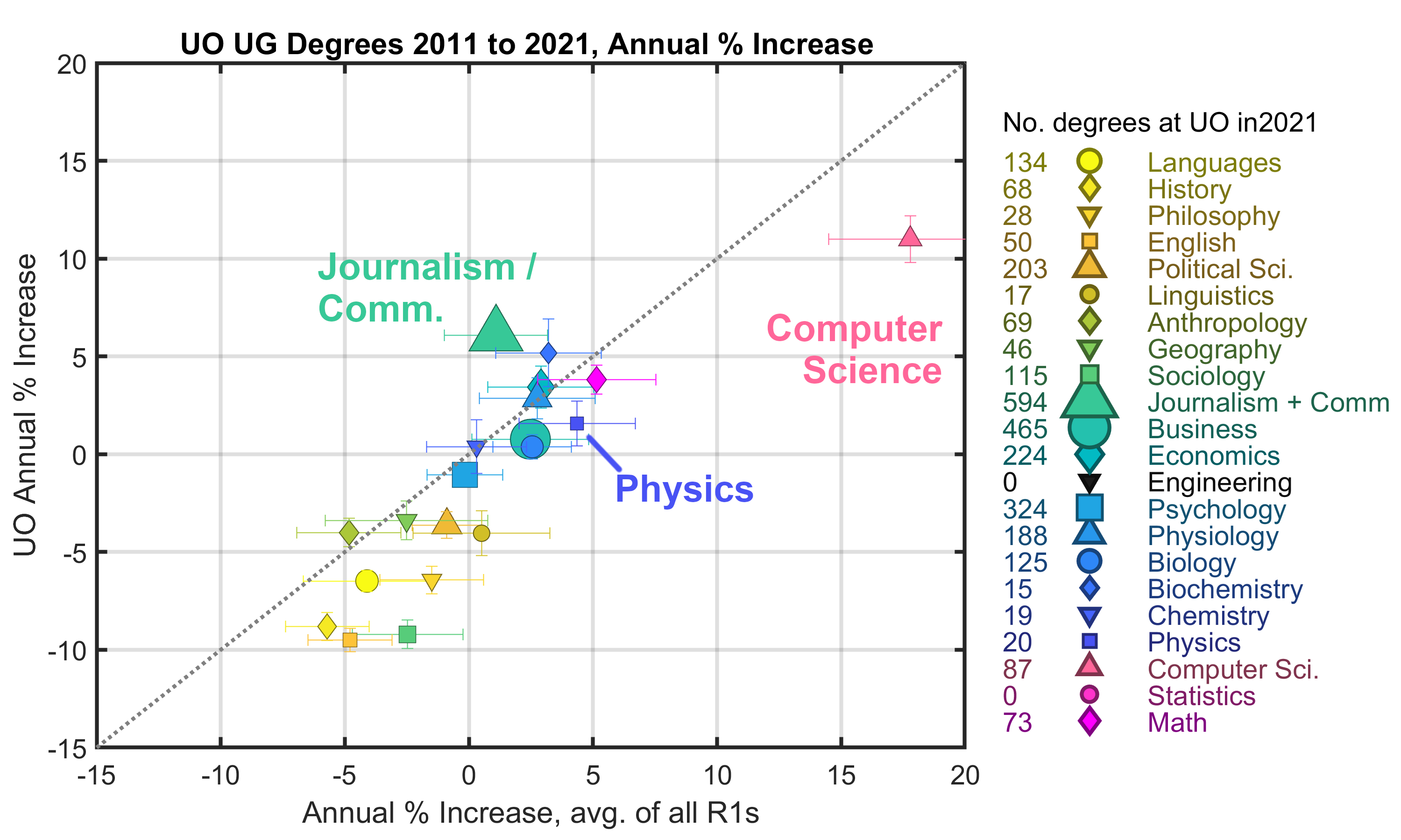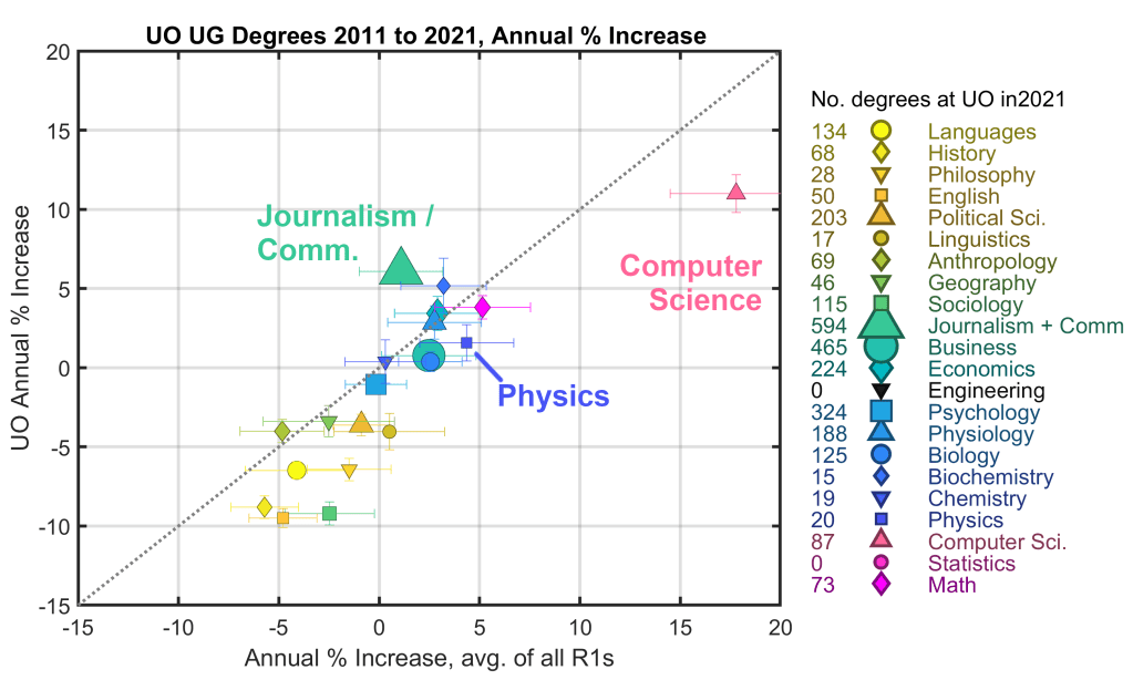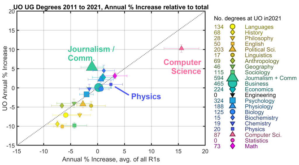 All great points! (1) I wonder how much students are influenced by measures like this — I really don’t know. (2) Yes, I’m a member of the Center for Science Communication Research, and I hope that this leads to some interesting activity! (3) Journalism alone at UO has a +3.2 % increase per year compared to -3.2 +/- 7.5 for all R1s — about half the value than if we include advertising, etc., but still surprisingly large. (And the opposite sign of most universities!)