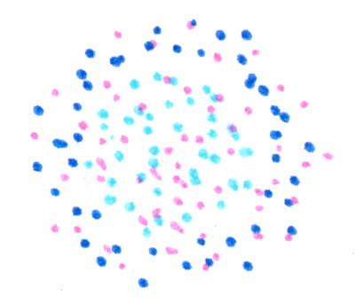 As always in this series, I emphasize the question and only briefly describe the answer. The key players are two proteins called MinD and MinE. MinD has two configurations, one of which has a much higher affinity than the other for binding to the bacterial membrane — this form is dark blue in the sketch below. Moreover, MinD is more likely to bind at the edge of a pre-existing MinD patch. MinE, pink in the drawing, will bind to membrane-bound MinD and induce MinD to switch to the low-membrane-affinity form (light blue). Imagine a patch of MinD at a membrane: