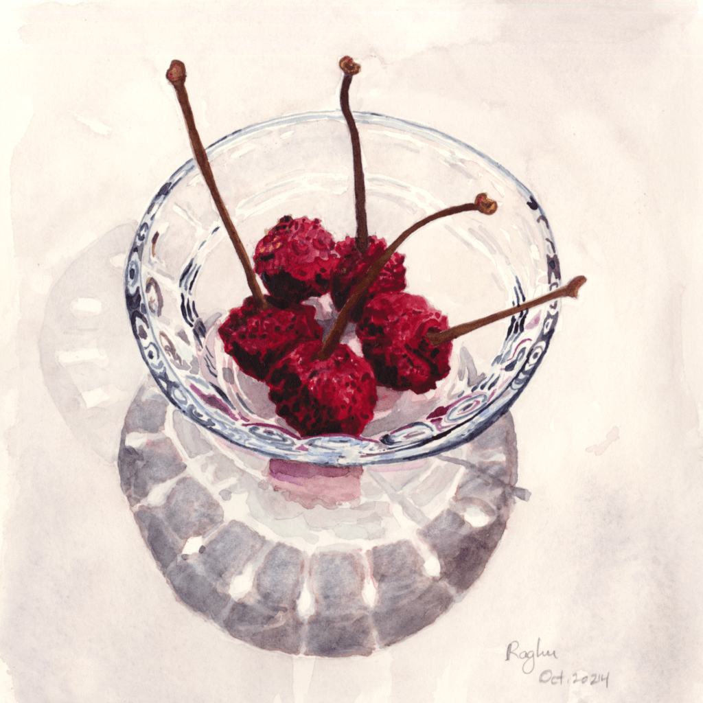 Back to the painting: The shadows ended up too muddy, but it’s fun to paint glass. I traced a bit of the edges, and drew and painted the rest unassisted.