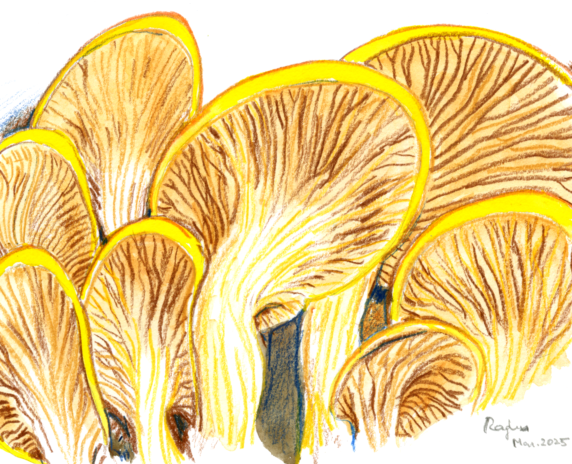 Mushrooms. Watercolor and colored pencil, based on a photograph in “Plants and Fungi: The Definitive Visual Encyclopedia” (2024); link, spotted on the new book shelf at the Springfield, OR library a few weeks ago.