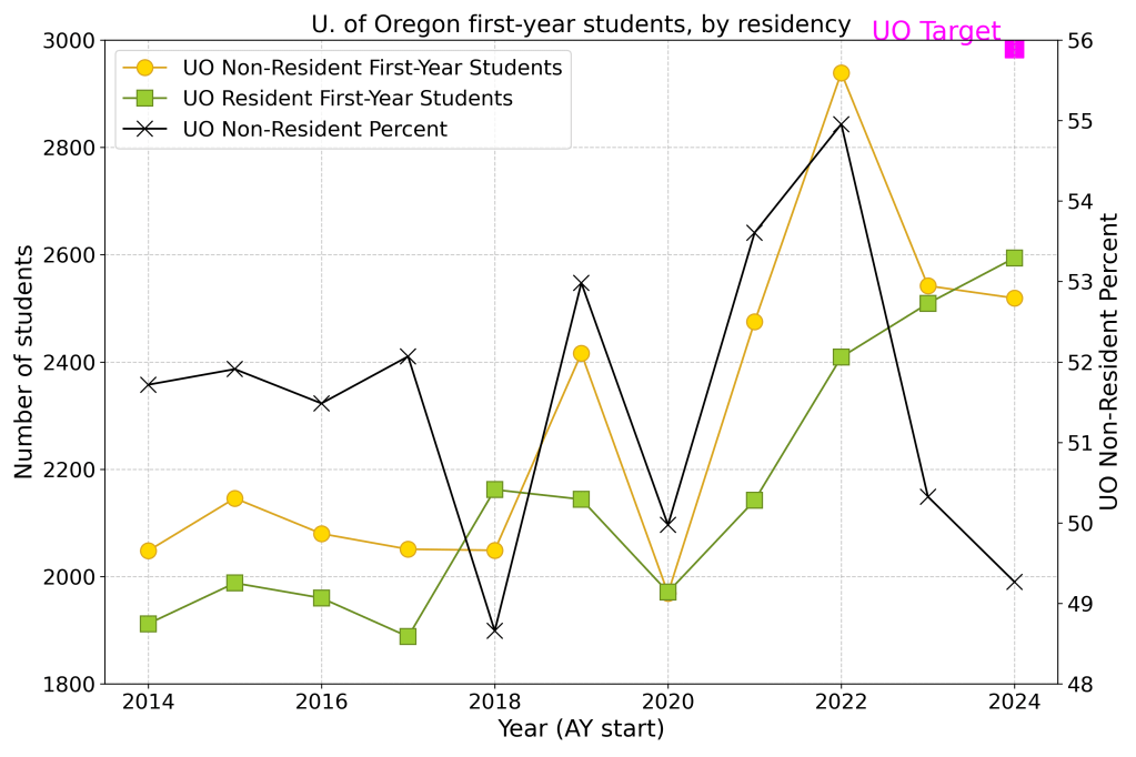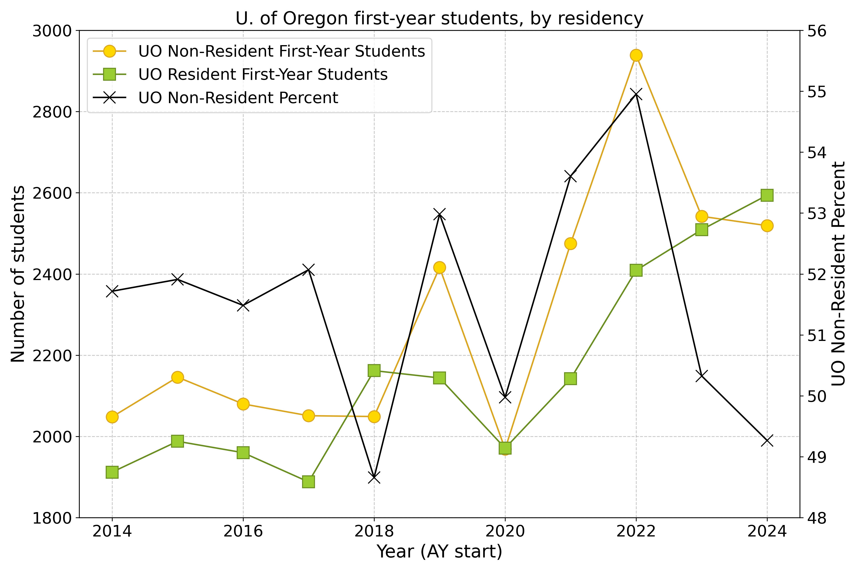 How many of each year’s first-year, newly enrolled, students at the University of Oregon are from out-of-state? This data is harder to track down; I stitched together a handful of sources before getting data from a presentation by UO student services, which I’ve plotted below. Note that “2024” refers to the 2024-2025 academic year, “2023” to 2023-2024, etc.