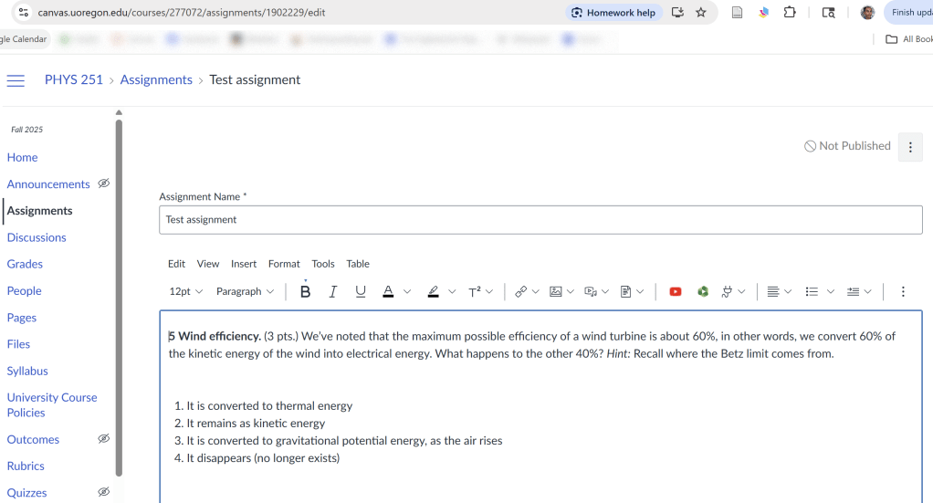 Does homework matter, in a college gen-ed science course? I’ve been thinking more about this question over the past year or two, as AI tools are able to quickly and correctly answer nearly all questions I could pose to students (see this 2024 post, for example, or the examples below). I often teach general-education courses aimed at non-science majors that satisfy the University of Oregon’s science requirements, most frequently The Physics of Energy and the Environment and The Physics of Solar and Renewable Energies (yes, the name is redundant; I didn’t title it). I assign homework each week, exercises that I hope will be interesting and useful for learning the course’s concepts (example).