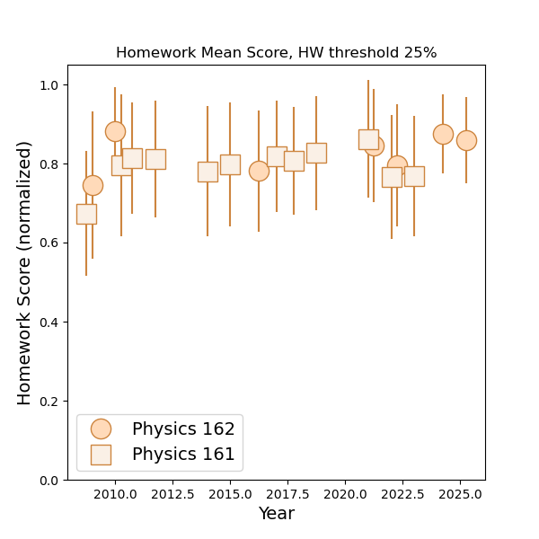 Last term’s homework correlation was lower than the average of recent years’, but not by much. The correlations have always been around 0.4 ± 0.2. There’s one outlier: Spring 2016, in which the correlation is roughly zero. I have no idea why; there was nothing unusual about the format of the course; no disasters struck; I didn’t write surreal exercises. Other than this anomaly, the data are quite boring. Perhaps the low 2025 value is the harbinger of further declines, but I can’t conclude this. The mean score on the homework assignments, again limited to scores above 25%, has been very stable: