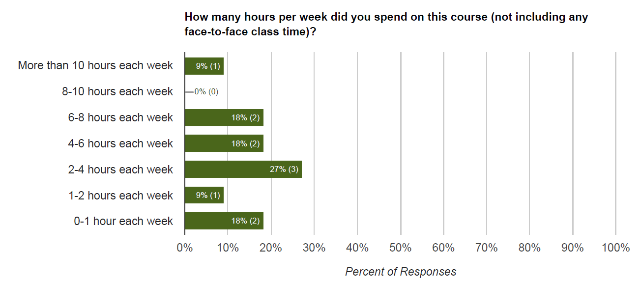 What, one might wonder, “should” correlations between homework and exam scores be? In physics, one is used to thinking of problem sets as extremely important — doing them is how most learning occurs. I recall countless hours per week, typically in one of the many libraries at Berkeley, spent thinking and scribbling, occasionally with satisfying bursts of inspiration as I figured something out. This, however, is a view of upper level courses that doesn’t much resemble the situation in gen-ed courses. First, the assignments are intended to be fairly easy, as is the course in general. Second, students have many opportunities to get assistance with the exercises — I devote an (optional) hour each week to this, in addition to my regular office hours; there’s no good reason not to be able to answer everything perfectly. The reader may find it interesting to note that, as is typical for these sorts of courses at a typical US university, students spend little time studying or doing homework for these classes. Here’s my most recent data, from the Spring 2025 end-of-term survey, which admittedly had a low response rate (20%):